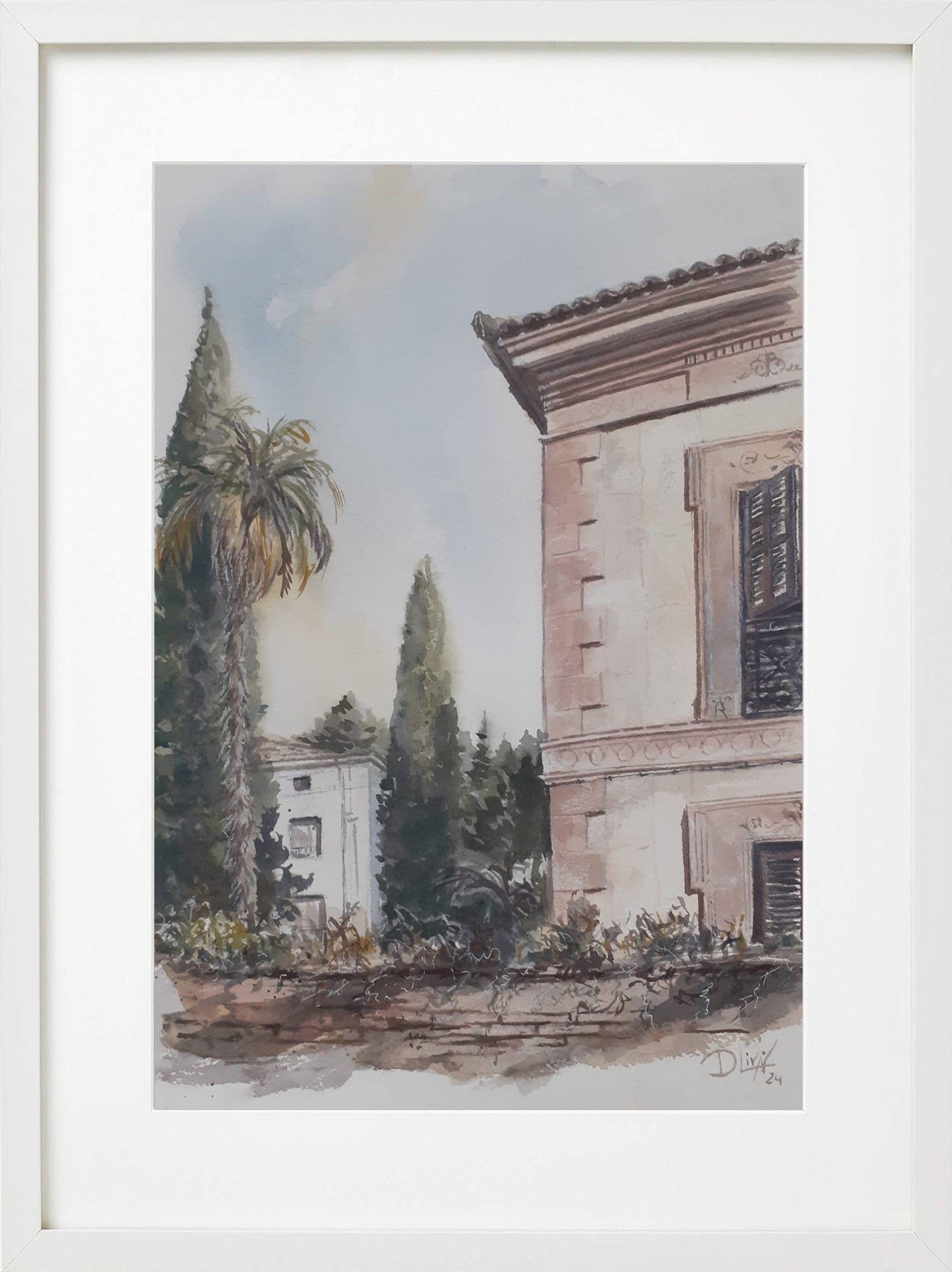Acuarela original de Diegolivan sobre papel Arches 300 g/m², 100% algodón, grano grueso. 30x40 cm. Serie Arquitectura Olvidada (2024).