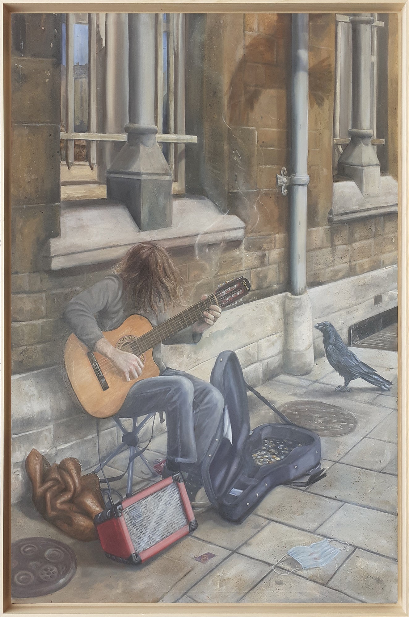 Realizado en el año 2021 vemos a un artista callejero en Oxford, tocando la guitarra mientras un cuervo lo observa atentamente. Una obra muy realista donde podemos apreciar innumerables detalles y texturas.